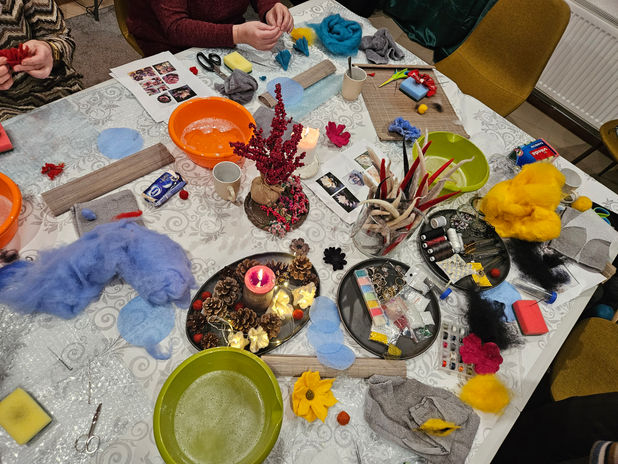 Katrā nodarbībā veidojam savu tematiku, piemēram, ziedu filcēšanu, brošu filcēšanu, pirts cepuru veidošanu u.c.